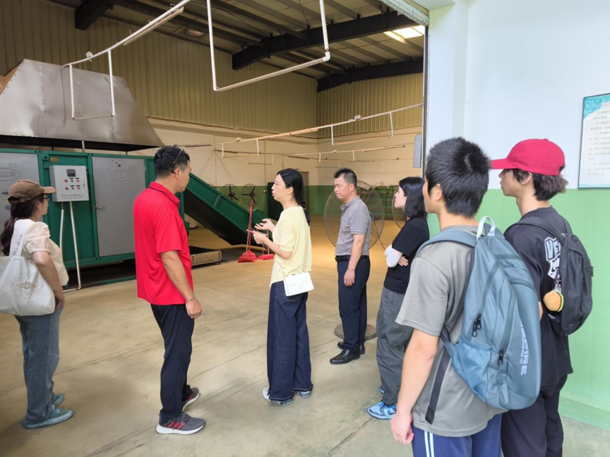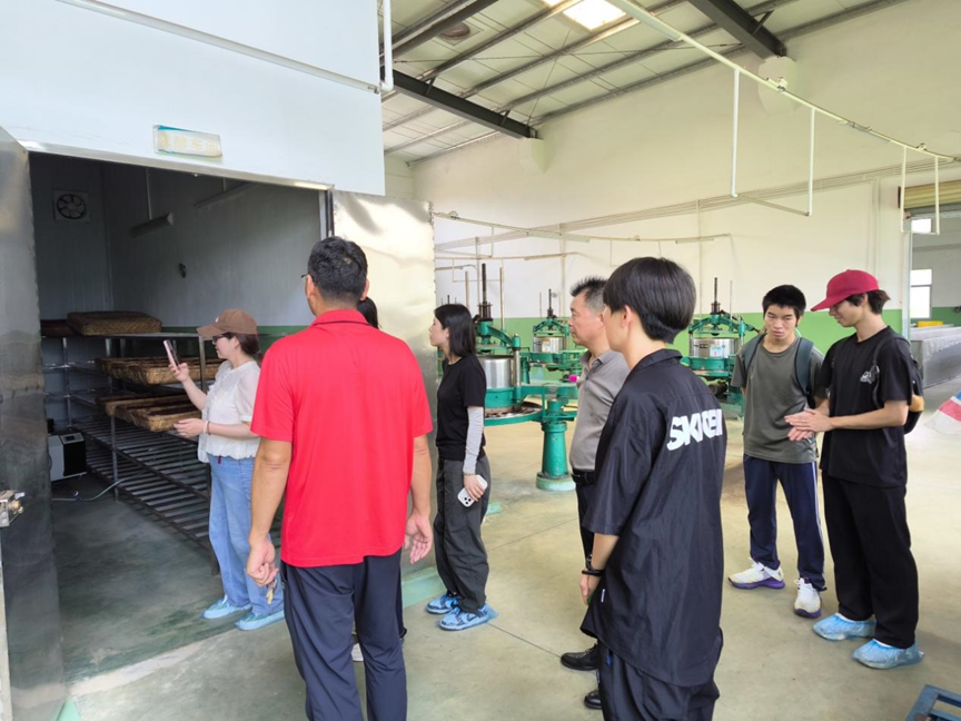 师生在英德天泽茶业车间,听工作人员介绍设备与生产,深入调研学习。老师与学生们专注聆听讲解,加深了对英德红茶制作工艺和销售渠道的了解。