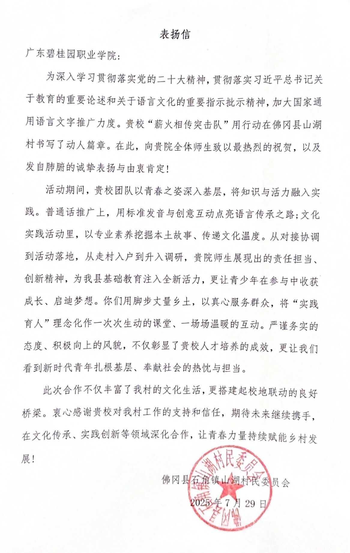 近日,共青团佛冈县委员会与佛冈县石角镇山湖村民委员会向我校发来表扬信,对校团委及智能建造与设计学院团委在 2025 年暑期 “三下乡” 社会实践中展现的组织力与执行力给予高度赞誉,更对 “薪火相传突击队” 师生团队扎根佛冈县开展的系列实践活动予以充分肯定。